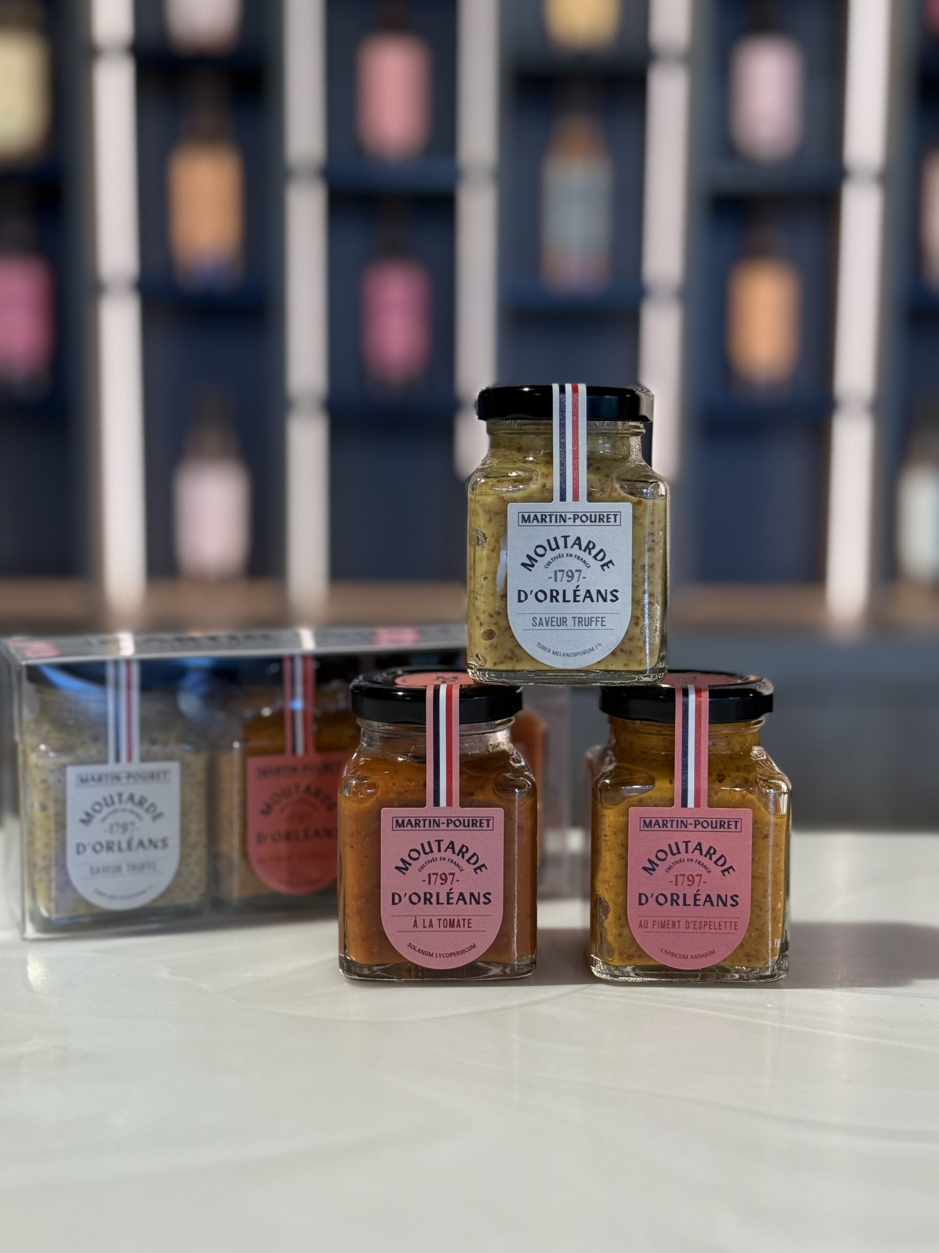 Moutarde à la Truffe : Moutarde d’Orléans (vinaigre, graines de moutarde du Val de Loire, eau, sel de Guérande, curcuma, arômes naturels, acidifiant : acide citrique, conservateur : disulfite de potassium), vergeoise, Truffe 1,1% (tubes Melanosporum), jus de truffe, arôme naturel. Moutarde Miel & Chardonnay: Moutarde d’Orléans (vinaigre, graines de moutarde du Val de Loire, eau, sel de Guérande, curcuma, arômes naturels, acidifiant : acide citrique, conservateur : disulfite de potassium), vin blanc Chardonnay (8%), Miel du Gâtinais (2%) Moutarde Onctueuse : Moutarde d’Orléans (vinaigre, graines de moutarde du Val de Loire, eau, sel de Guérande, curcuma, arômes naturels, acidifiant : acide citrique, conservateur : disulfite de potassium